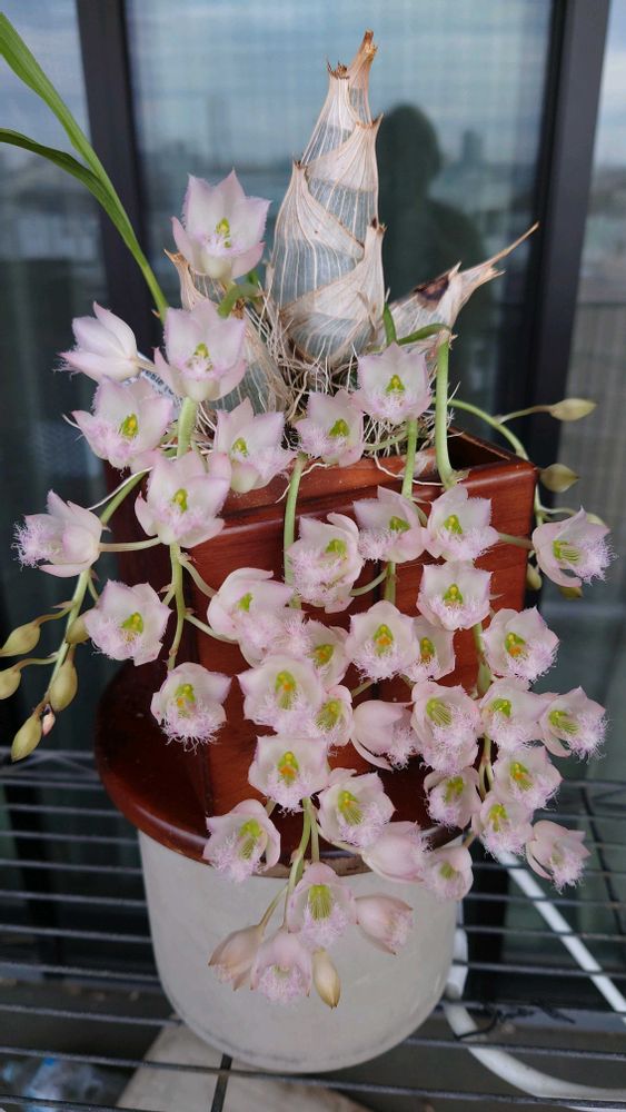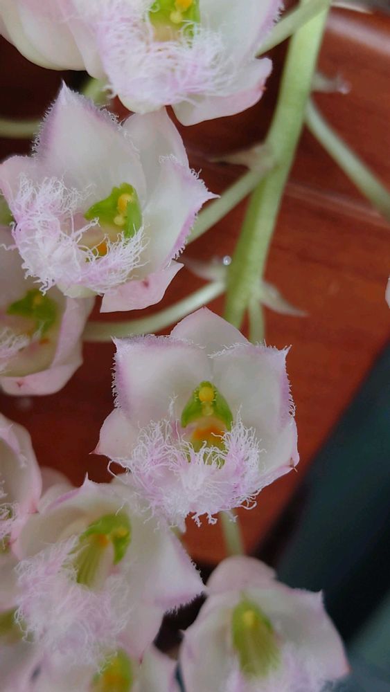 全体に薄めのピンクで縁が少し濃く、リップのモシャモシャもピンクの濃淡あり、コラムの緑はしっかりめ。抱え咲きというんでしょうか、花弁が開いてない分、小さいものの丸みの強い愛いらしい形。毎朝、花を見、薫りを楽しみ幸せに浸っています。