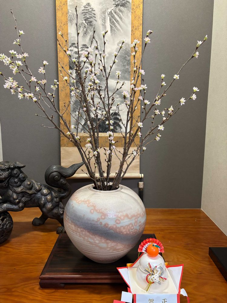明けましておめでとう🎍今年も仲良くしてね〜宜しくお願いします🤗 啓翁桜も開花して新年祝ってくれたのね😃優雅な床飾りやわ😍💕