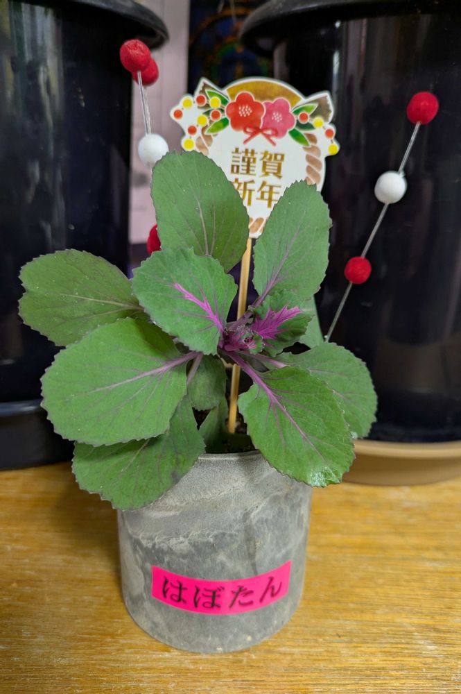 家の小さな葉ボタンをお正月バージョンに変身して職場玄関に飾りました😁💕