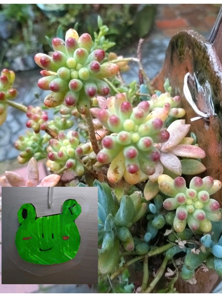 乙女心の先っぽの色合いが可愛いですね、カエルさんも上手に掛けてて👏🐸ほっこりしました✨