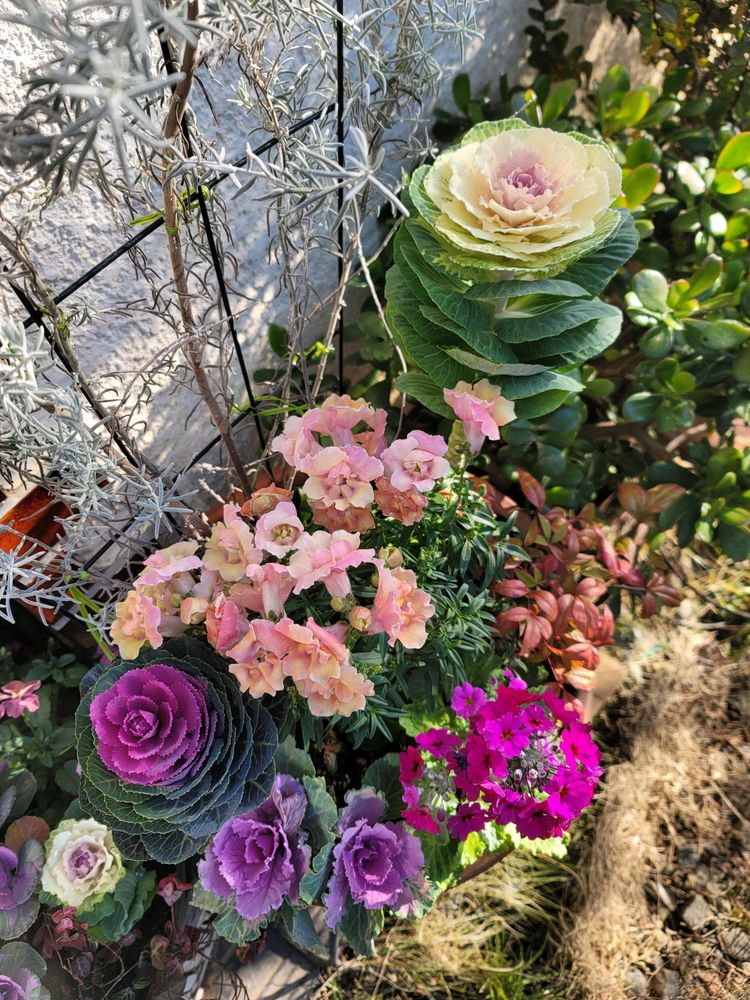 エレモフィラ・ニベアも大きく成長し葉牡丹やプリムラそして金魚草かな?