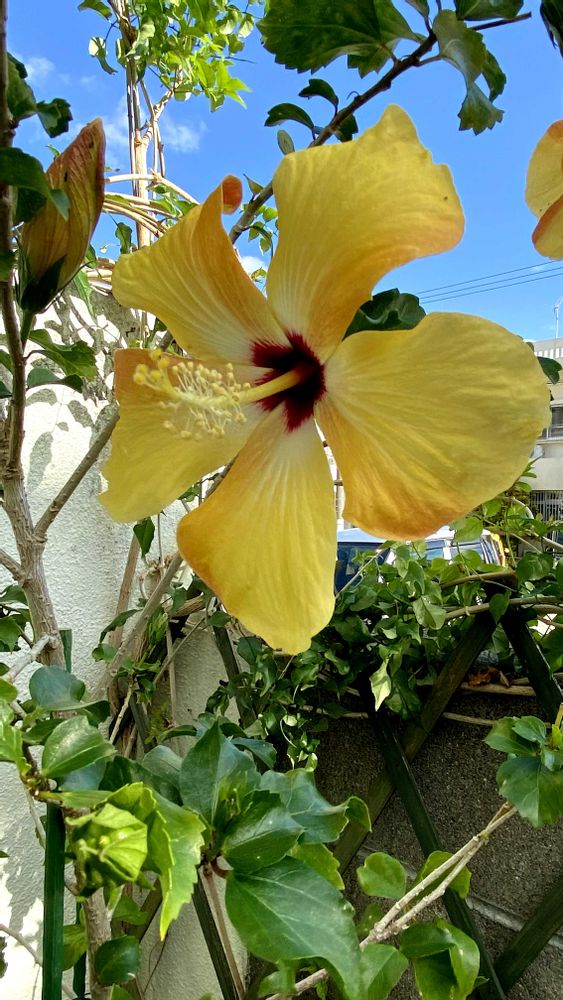 今朝〜我が家の門扉前のハイビスカス🌺が綺麗な大輪の花を咲かせています💕🌺💛🌺