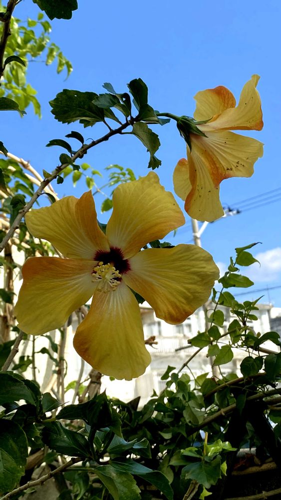 ビタミンカラーの黄色いハイビスカス🌺ですが…今朝は花びらのふちがオレンジ色🧡に染まっています😳