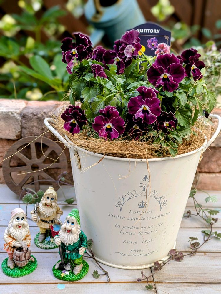 今回はビオラ系は小さなブリキ鉢にこじんまりと植え付けが多いかな。。。😉😌