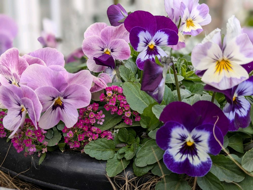 ①「ビオラ」「スイートアリッサム」色とりどりの寄せ植え