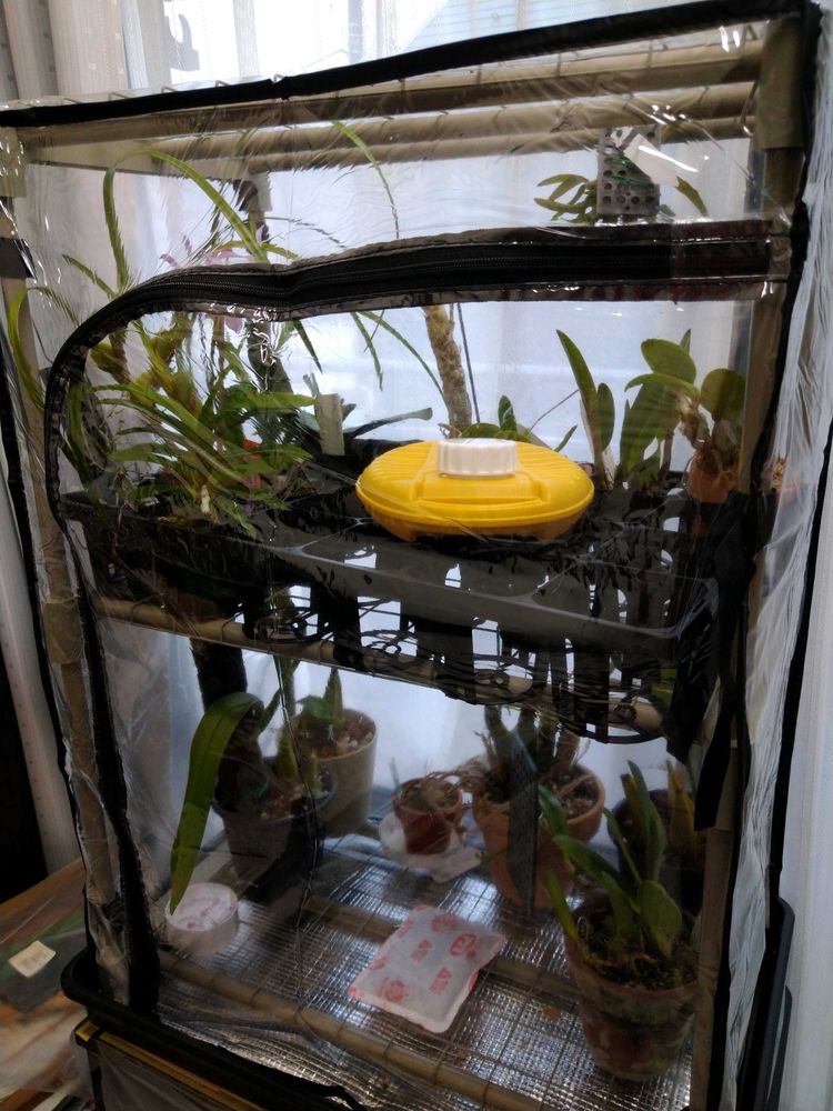 家人の理解を得られないため、(家人いわく)大げさな設備は整えられず、湯たんぽ入れたりカイロを入れたり(笑)しながら、過去24時間くらいの湿度と温度を記録してくれる温度計で様子を確認しつつ、朝から晩まで蘭棚のことばかり考えております(笑)