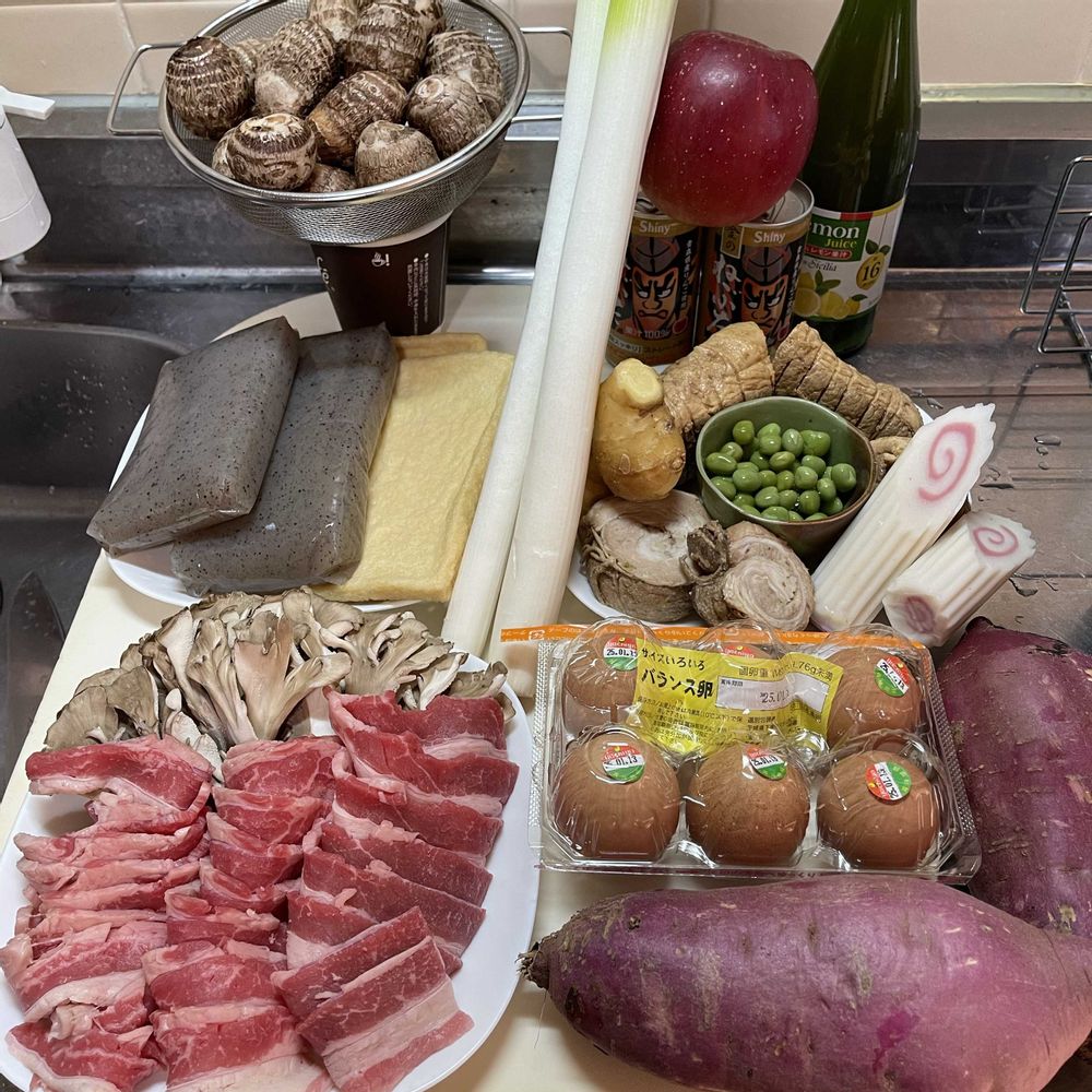 ➋ 日曜日の食材たちです♪やる気満々です♪♪ でも笑っちゃうのはこの中で当日買って来たものはお肉と長ネギだけなんです🤭 あとは孫の芋掘りと、自作の物と、我が家のストックと、いただき物ばかりです😜