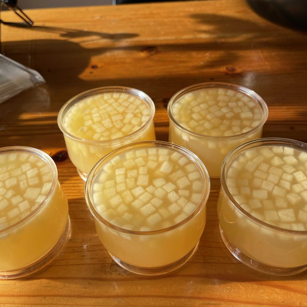 ➎ 濃縮還元してないストレートのリンゴジュースをいただいたので、100%のリンゴゼリーをデザートにって事で、 はい🙂↕️ちゃ~んと孫の人数分に分けましたよ〜😘