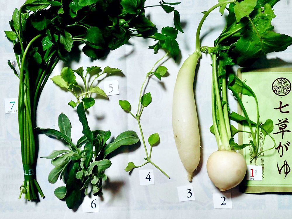 春の七草と七草がゆ①ナズナ、②スズナ(かぶ)③スズシロ(だいこん)④ハコベラ⑤ホトケノザ⑥ごぎょう⑦セリ