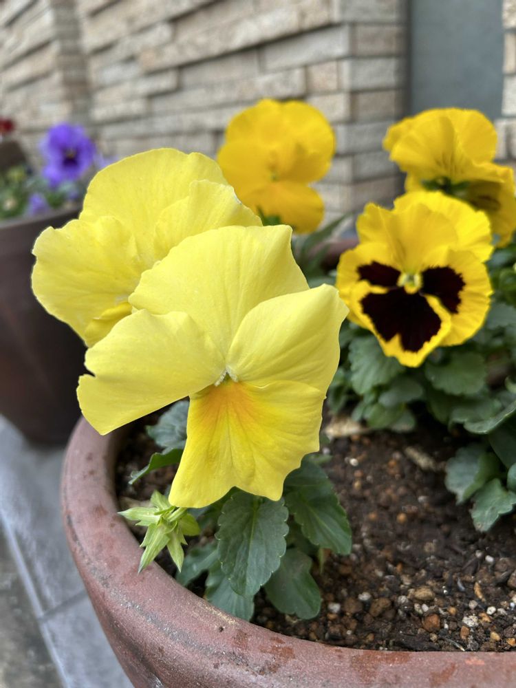 黄色のパンジー元気もらえますね💕我が家も寄せ植えの中に黄色のパンジー植え込んでいます。ピンク色も好きだけど、最近は元気もらえる黄色が好きになってきました。台所やお手洗いにも黄色のお花生けています🌼🌿白や赤色のお花も一緒に💕