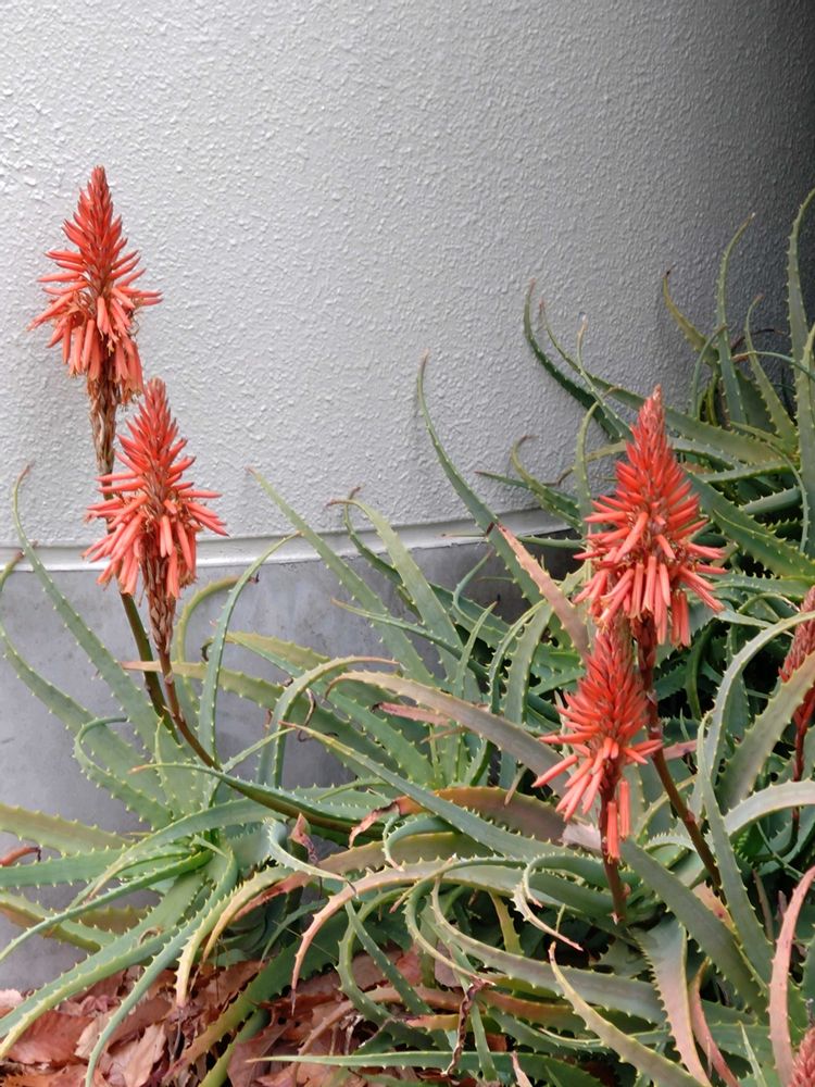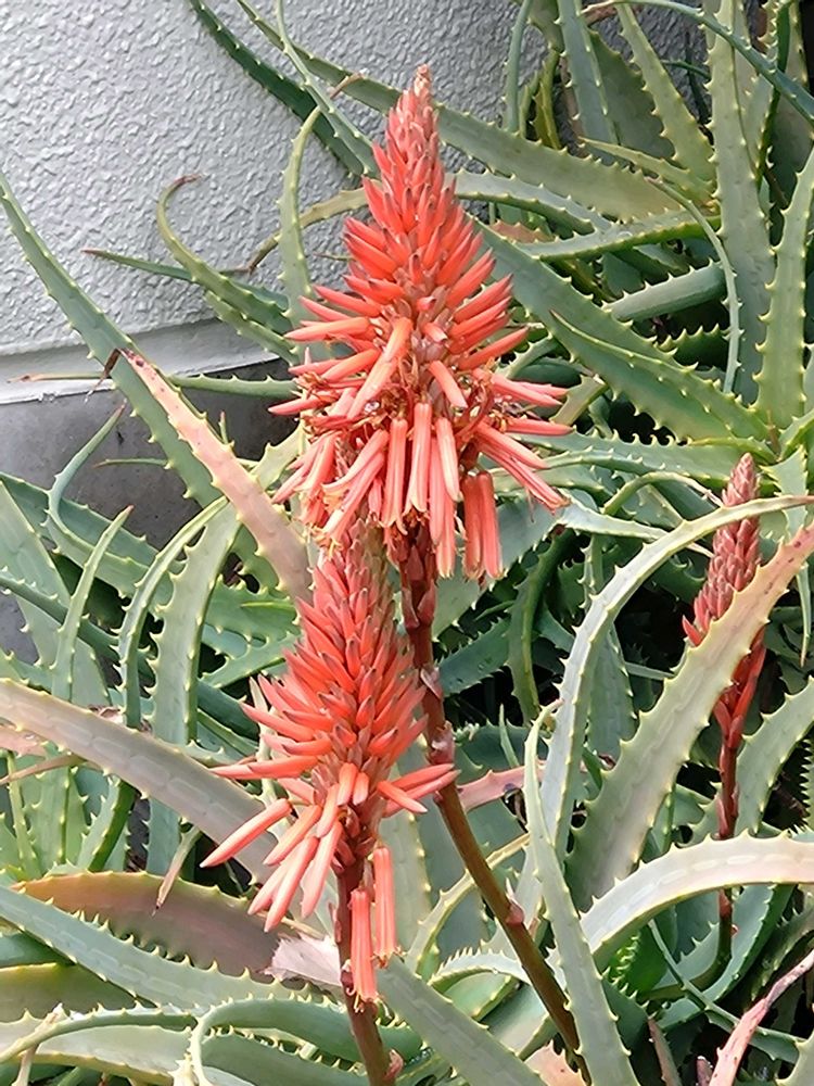 ❷❸アパートの空き家の下にアロエの花が雨上がりで鮮やかな色で咲いていました