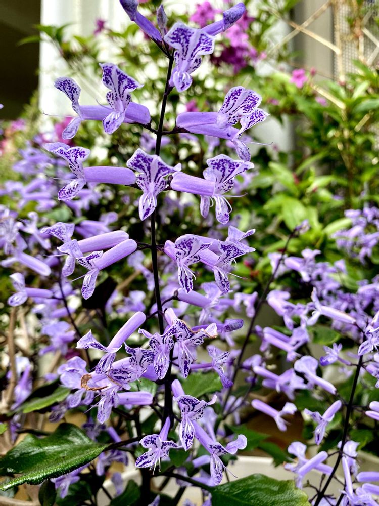 ちょうど…見頃を迎えています💕🥰花はラベンダーに似た筒状の濃紫色に斑模様が入り…とっても綺麗で大好きなお花です💕大人っぽい雰囲気も素敵〜💕💓