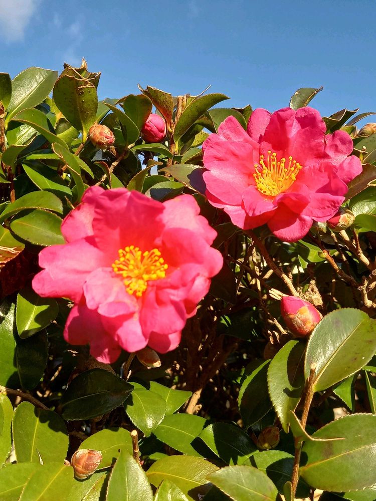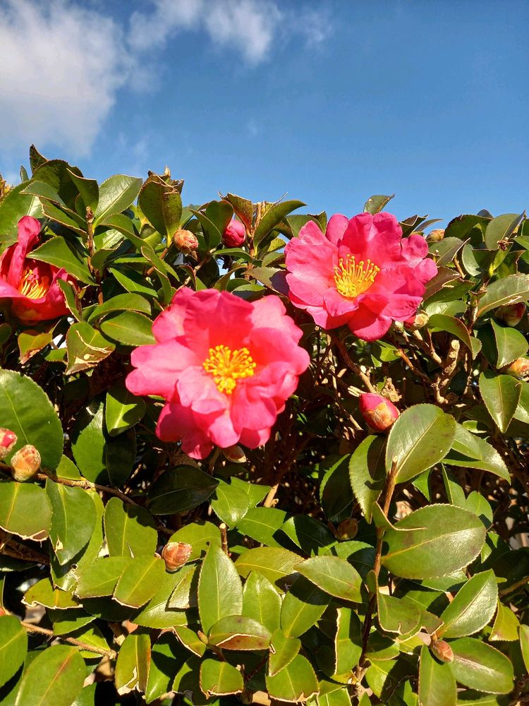 青空💙に濃いピンク💗のサザンカ、本当にまぶしくてきれいですね🤗
