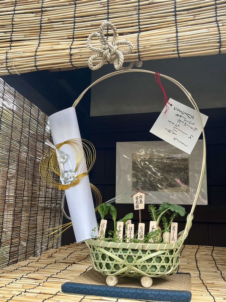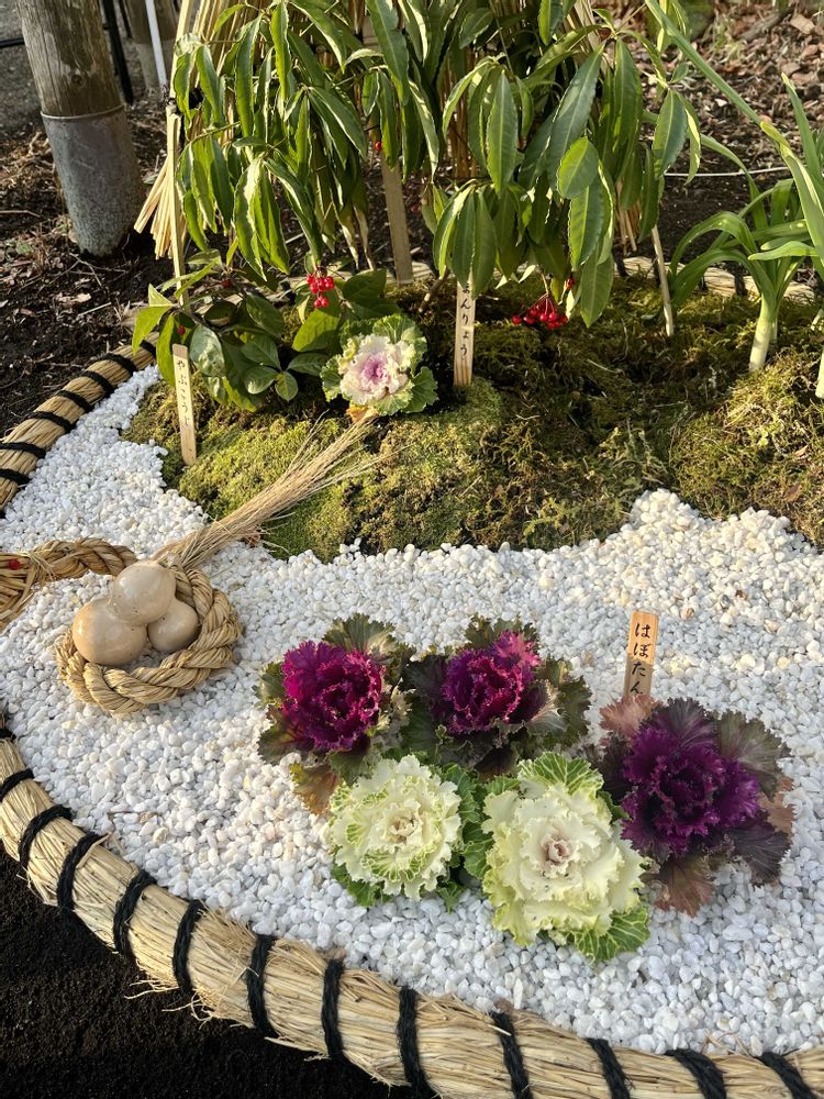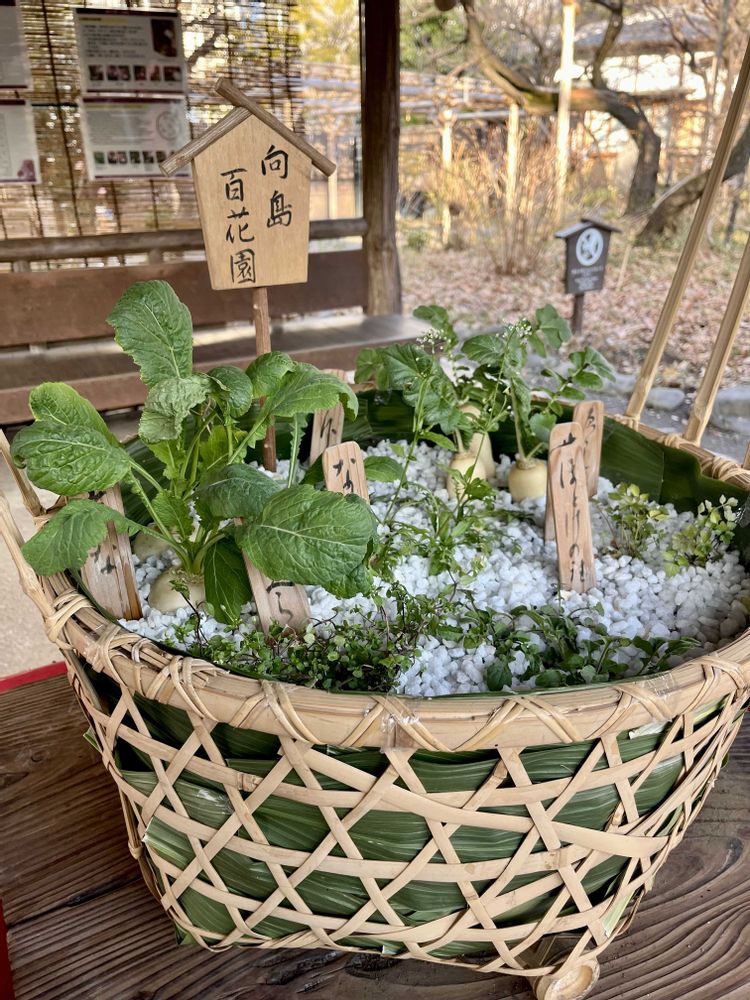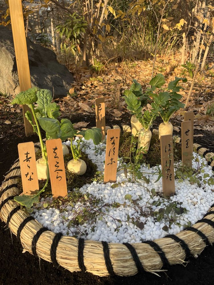 冬枯れの庭園には、あちらこちら春の七草が飾られていました