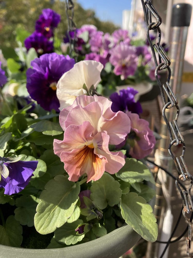 今日は青空。ピンクっぽいビオラが咲きました。2種類のビオラを種取りして4年目ですが特徴が混じってきている気がします。