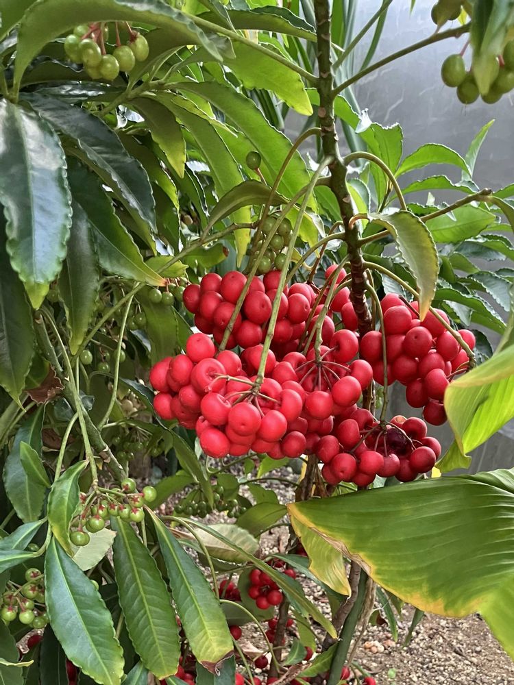 温室は矢張り 万両さん居心地が良いのですね〜 モリモリの赤い実をつけて 見た事無いです😊❤️❤️❤️