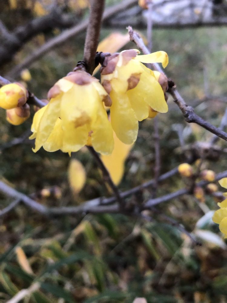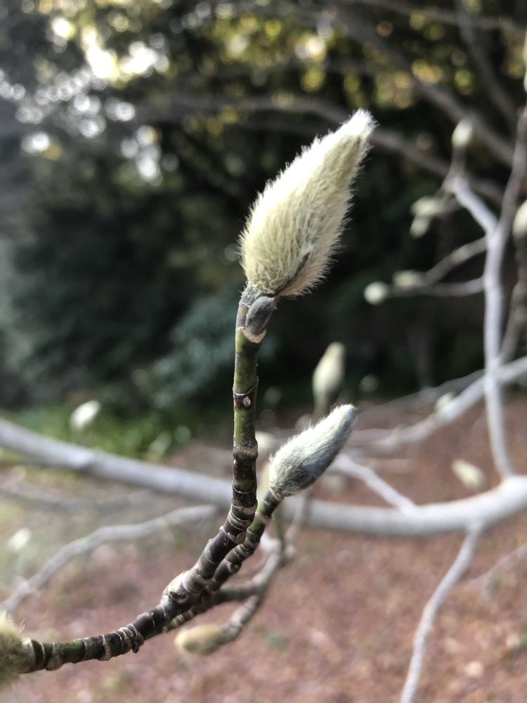 道路沿いの草村にて、黄色い「ロウバイ」や銀色の「モクレン」の蕾を見て、ほんの少し春を感じました。📸💛🩶😊😄🌞✌️