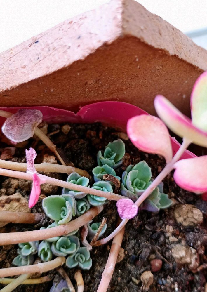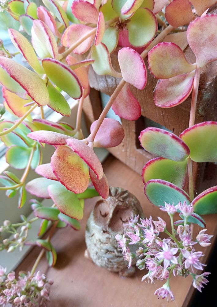 葉が🩷ちょっぴり染まって花が咲いてるミセバヤさん🩷素敵な陶の鉢やフクロウさん〜💚✨✨✨(((o(*゚▽゚*)o)))✨✨✨