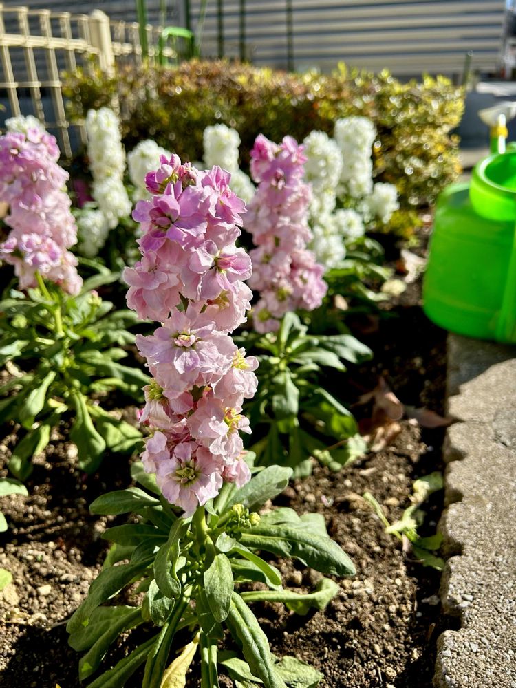 昨日か今朝か、植えられたばかりのストック。ジョウロ💦がしまい忘れの置きっぱです。