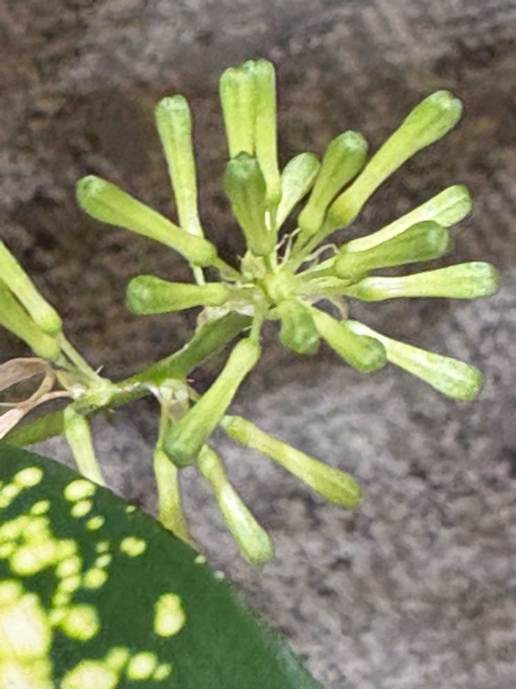 こんばんは、ドラセナゴッドセフィアナ。別名ホシセンネンボク。家のリビングでも昨年花が咲き良い香りを漂わせました。