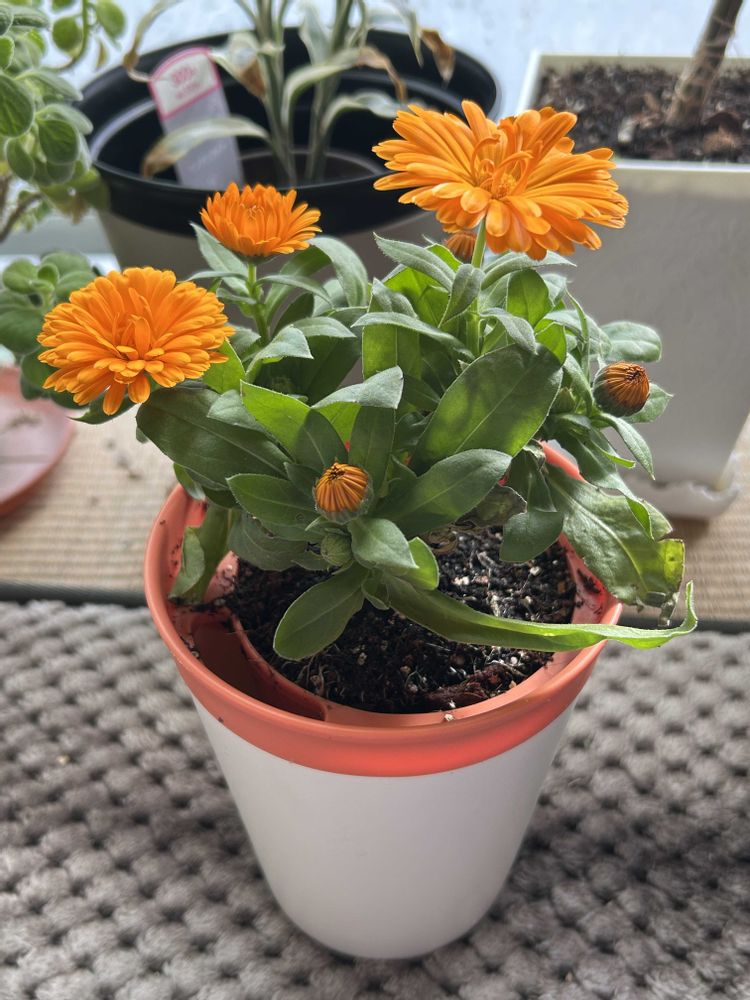我が家の室内にて彩ってくれているカレンデュラとニューギニアインパチェンスです。