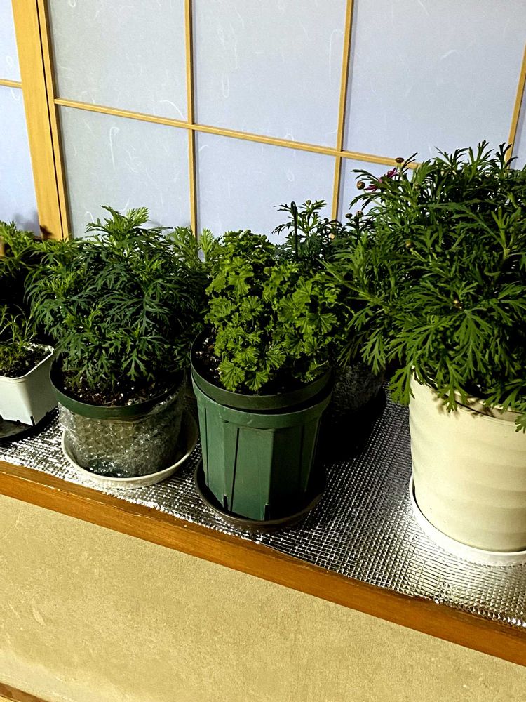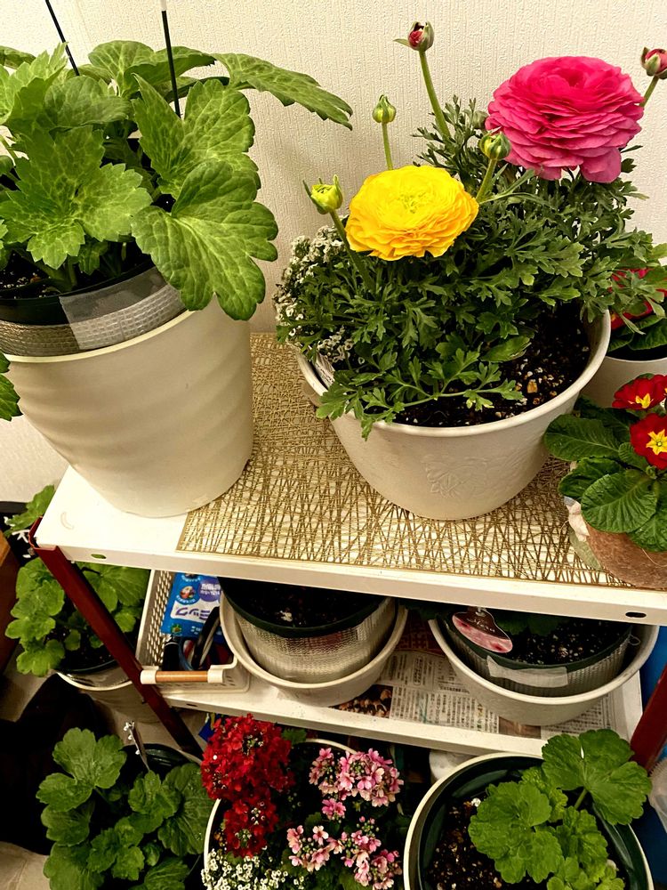 大雪注意報⚠️避難❗️お花をです😹雪に1番弱い子は玄関内。次の子は風雪を避けられる玄関前隅っこ。次は南と東の軒下。耐寒最強のビオラやパンジーは雪に載ってもらい、そもそも寒さがダメな子は冬場ずっと和室の窓際に🪴夜は不織布を被せます。