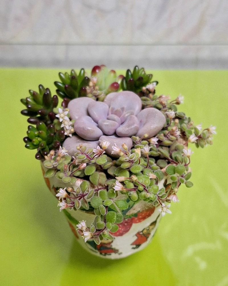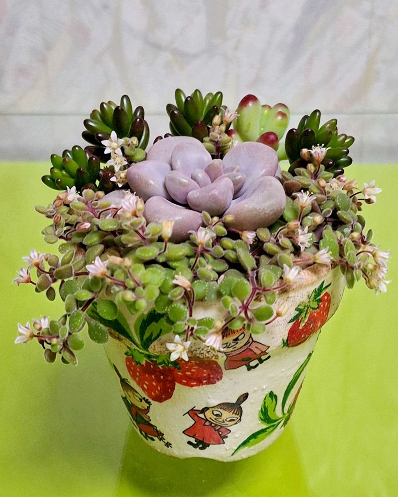ぷくぷくさんにブロウメアナの愛らしいお花が散りばめられて可愛い寄せ植えですね💕