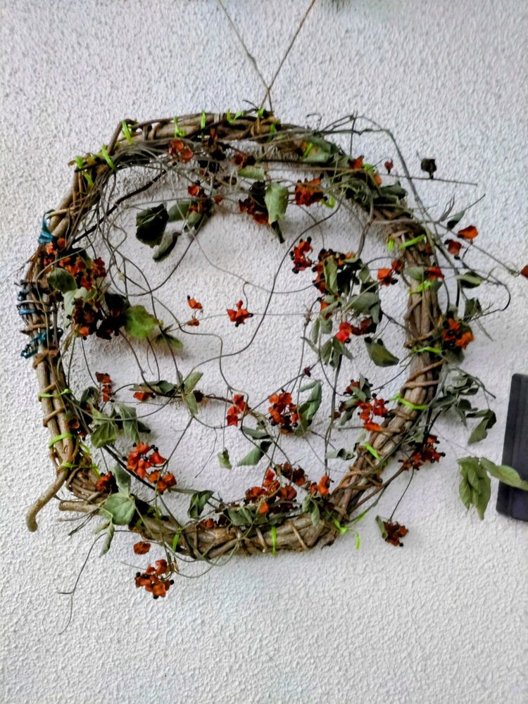 こんばんは🌃🤗昨年正月休みで孫と私達住宅の公園で、孫がサッカーの練習しているのに付き合い球拾いしている時フェンスと木に絡みついてるタンキリマメが、ドライフラワーみたいになってるのが綺麗で、家にあるリース(主人が前、畑の側のつるで作った)にただ絡まらせたのに