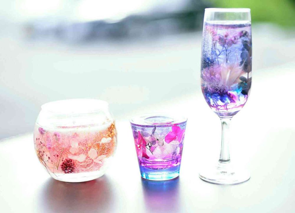 ねこさんのワークショップで作ったジェルキャンドル(左)と一目惚れでお迎えした(中、右)もの💕