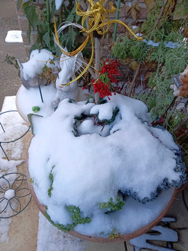⑤福岡も今日は、雪が積りました…鉢植えの葉牡丹も真っ白です…昨夜、家の中に入れるべきでした🤣