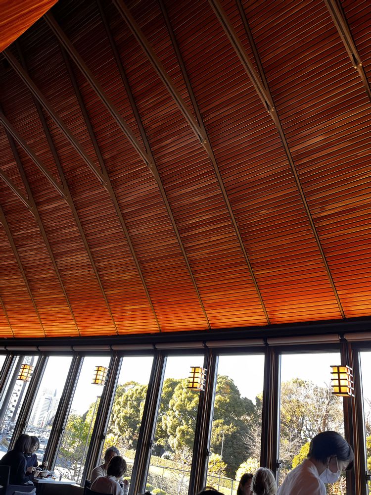 さん、はい、虎🐯ですね!ただ色々なところに巳年サインが書かれておりました。こちらでお抹茶をいただきました.茶器はしっかりと巳年の柄でほっこりでしたよ。二枚目の美しい天井の建築と、窓一面に映える外の緑が一体化する空間でした♪
