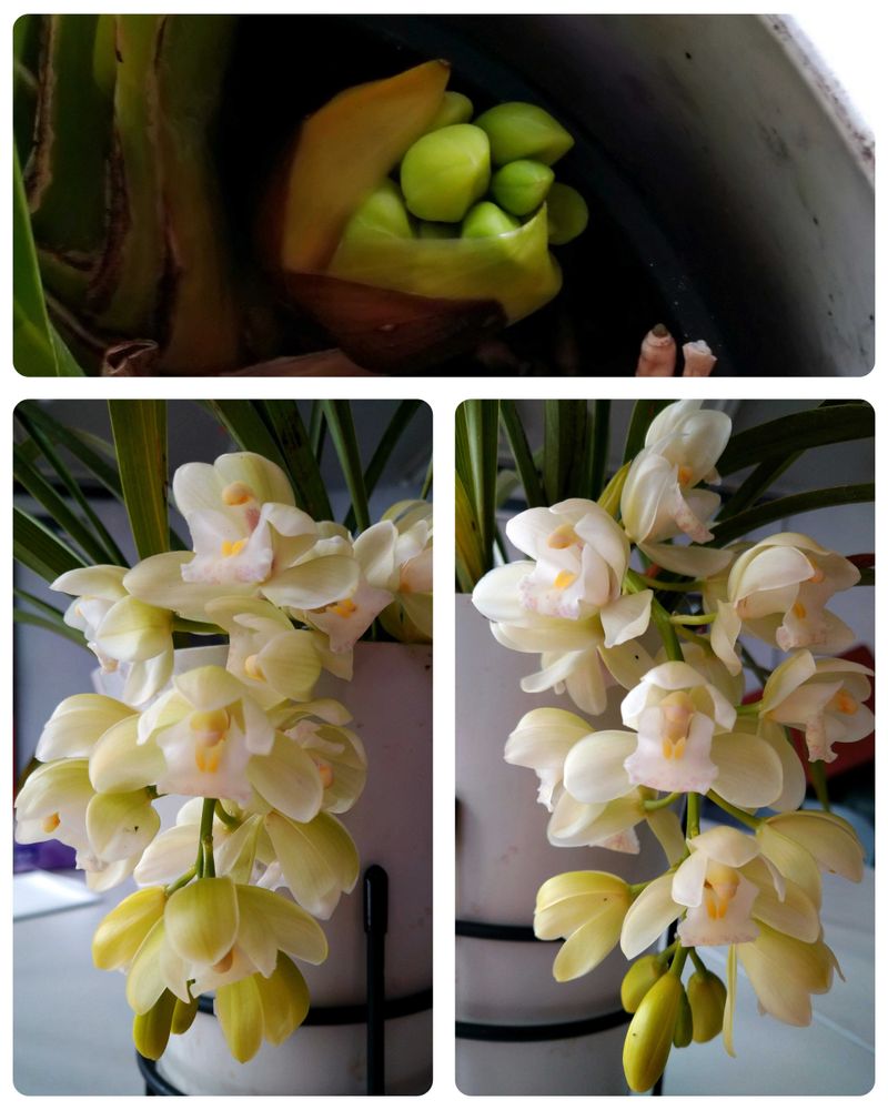 シンビジウム サラジーン アイスキャスケード。花芽が3つ出た状態でお迎え。そのうち2つがどんどん伸びて開花してます。