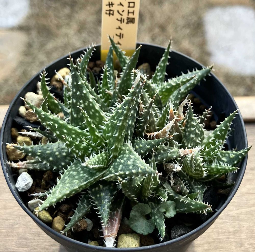 アロエ、ハオルチオイデス×ディスコイングシーの交配種です。非常に小さく群生する感じです。ハオルチオイデスの葉の細さはあまり好きじゃないので買ってないですが、この葉幅が広いのは好きです。