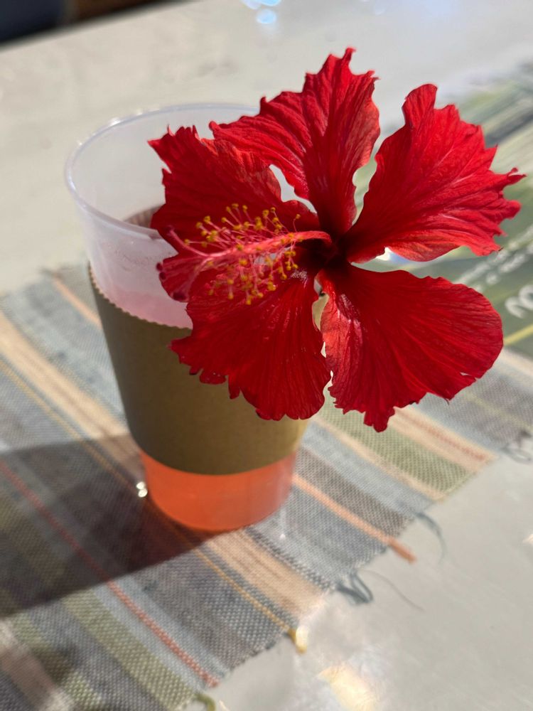 ②は、造花を付けて提供してくださったHOTハイビスカスティーです。