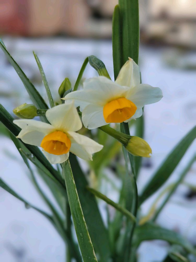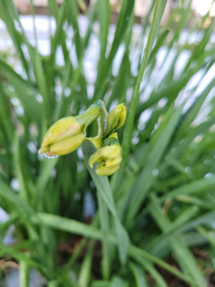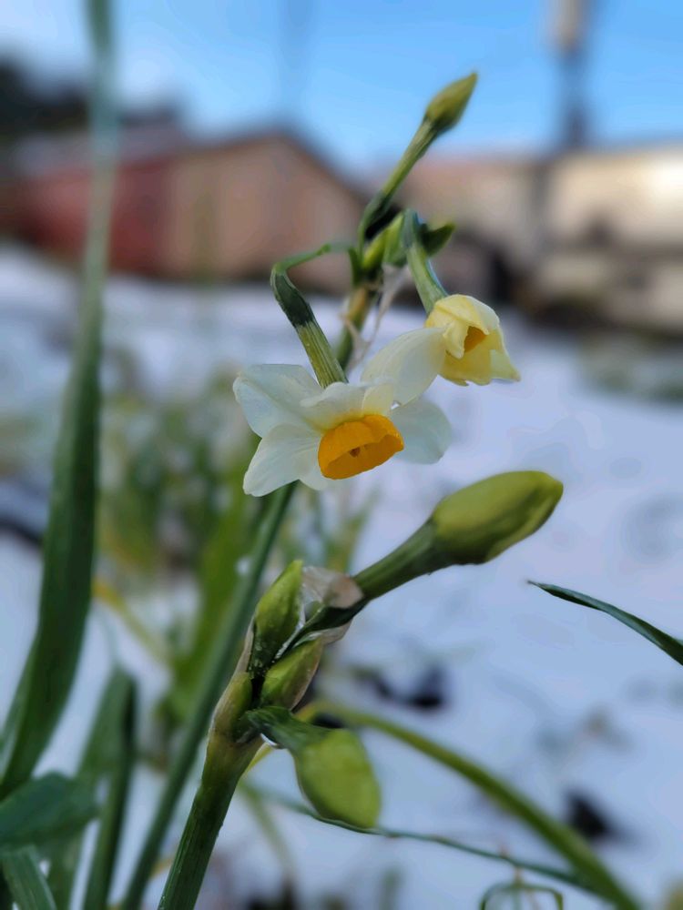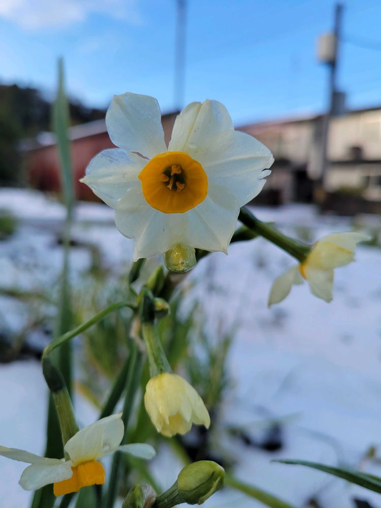 家の周り巡回❄が少し積もっている中水仙見つけました.ᐟ.ᐟ