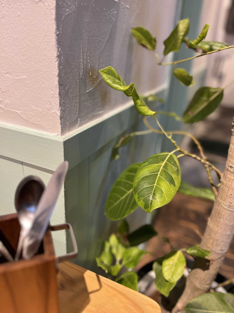 入り口から様々な観葉植物達がお出迎え。室内の子は綺麗な艶々の葉っぱでした💓