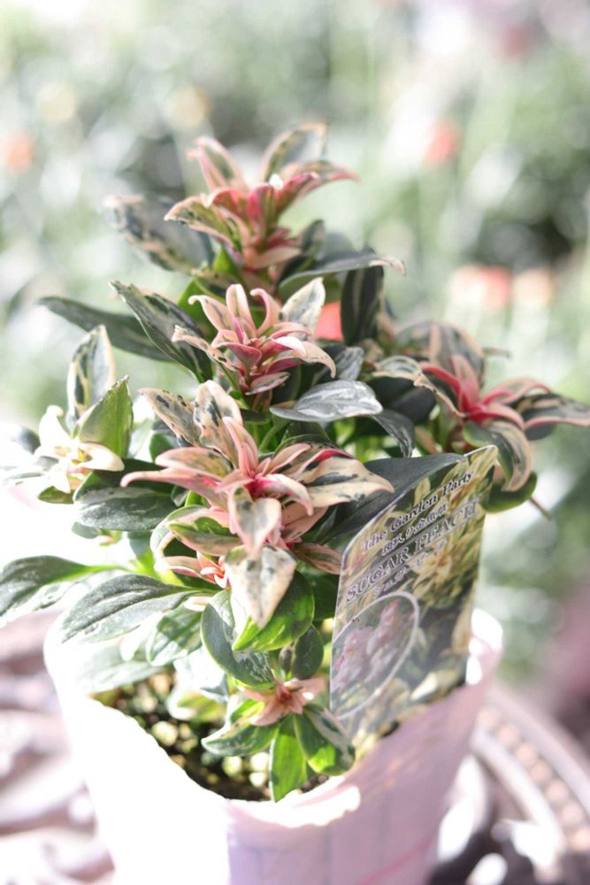 淡いピンク〜クリーム〜グリーンの斑入り葉が魅力✨寒さで葉先がワイン色に変化し、淡ピンクの花も楽しめる華やかな品種です🌸