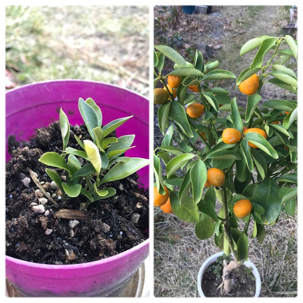 左が去年種を植えたら発芽したキンカン、右の様に実が沢山実るのはいつの事やら。