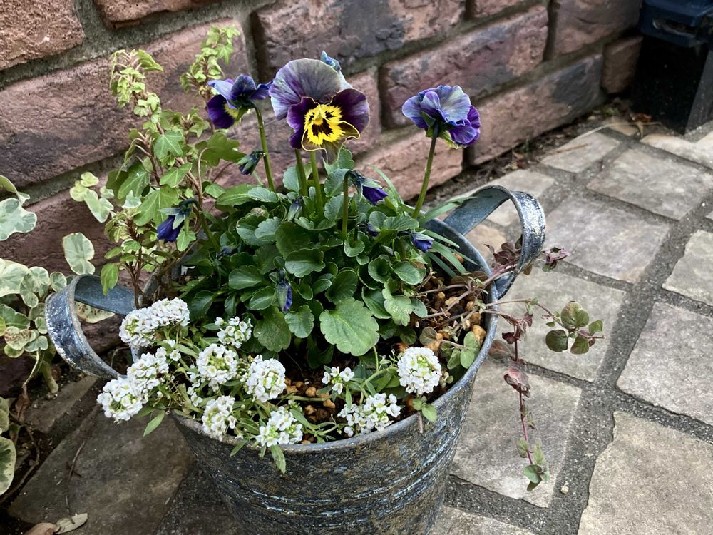 その辺のリーフやアリッサムをかき集めて簡単寄せ植えに😀