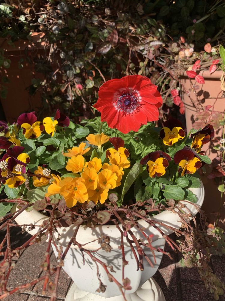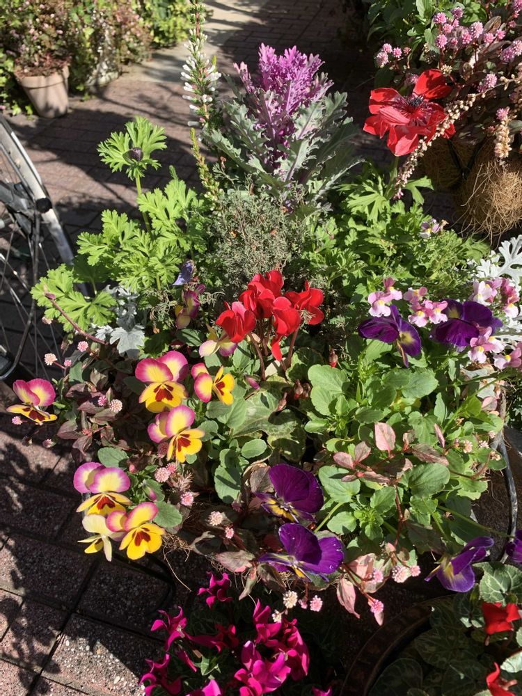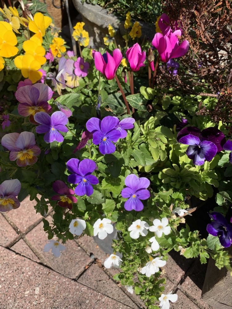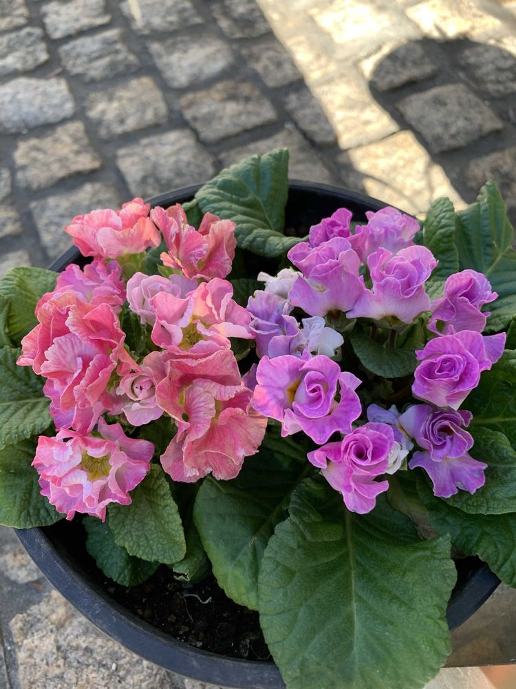 クルクルしてるのは バラ咲のプリムラです。 我が家にもう少し白っぽいピンクのがありますが 今咲いてる中で一番のお気に入りです。