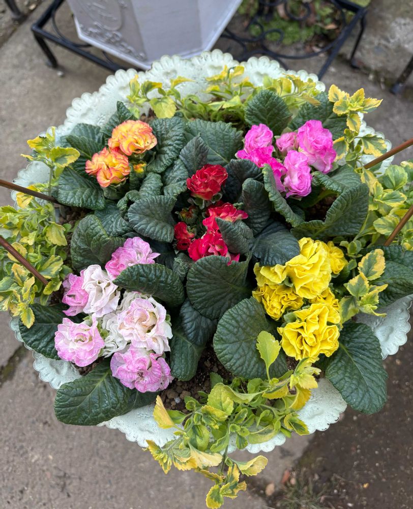 ブリキ鉢にフリンジ咲きジュリアン『モンシュシュ』を寄せ植えしてみました🤭🌸