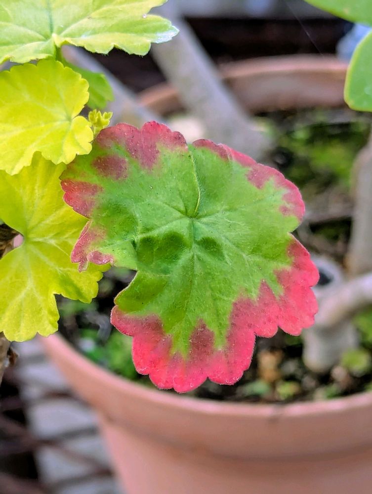 ゼラニウムのはが、紅葉して綺麗ですネ❣赤色がとても綺麗で見惚れました(◍•ᴗ•◍)❤🌿