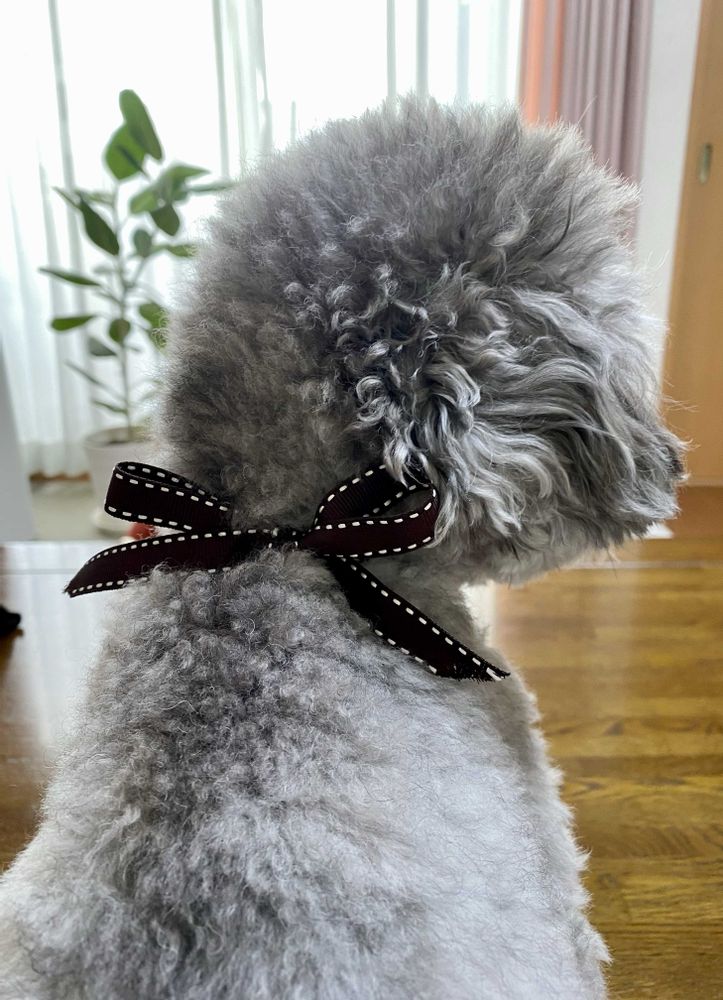 頂いたクッキーについてたリボンをワンコの首につけてみました
