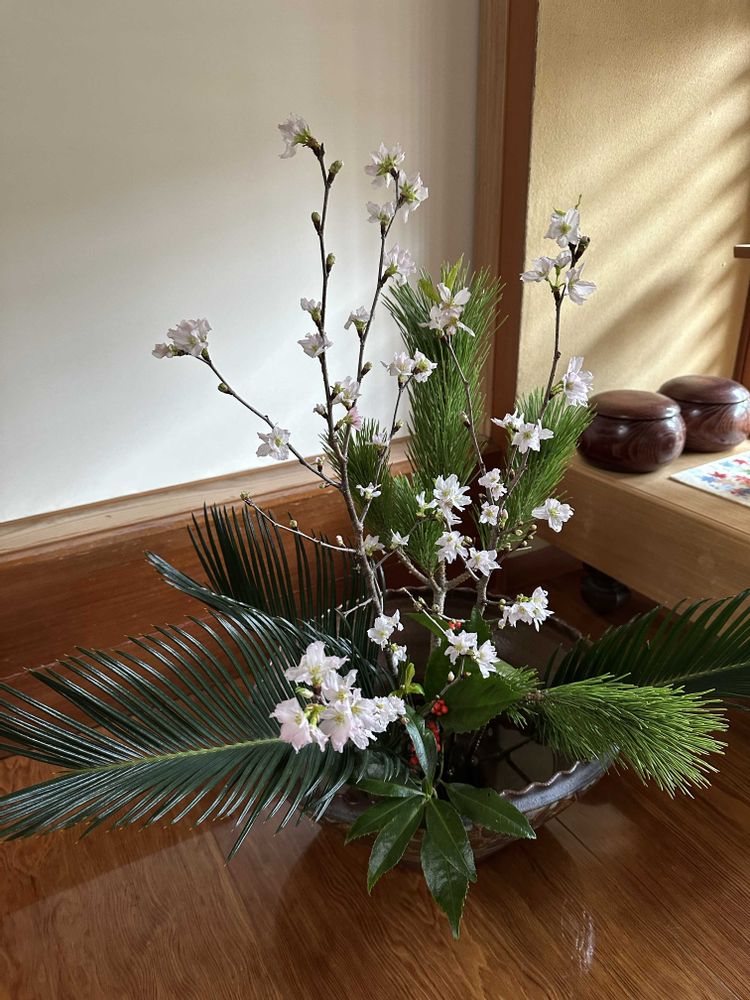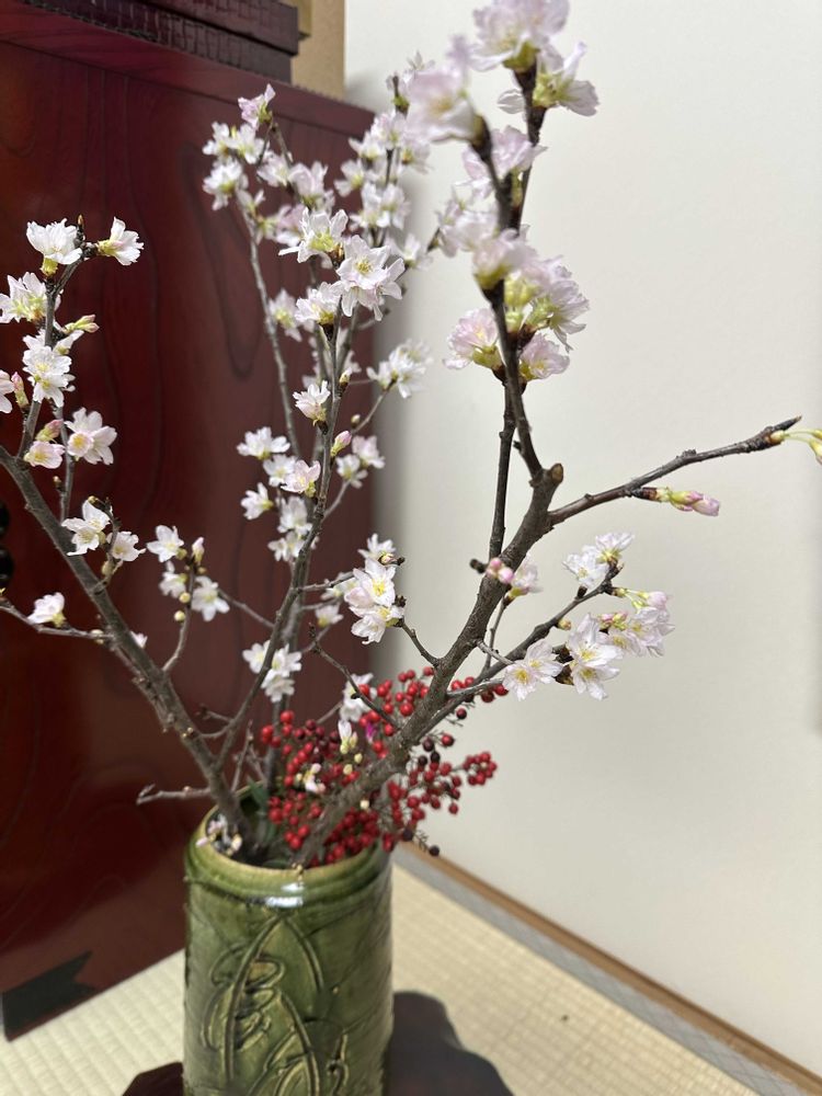 お正月の生け花、他の花はダメになりましたが、啓翁桜がかわいいお花をいっぱい咲かせましたので