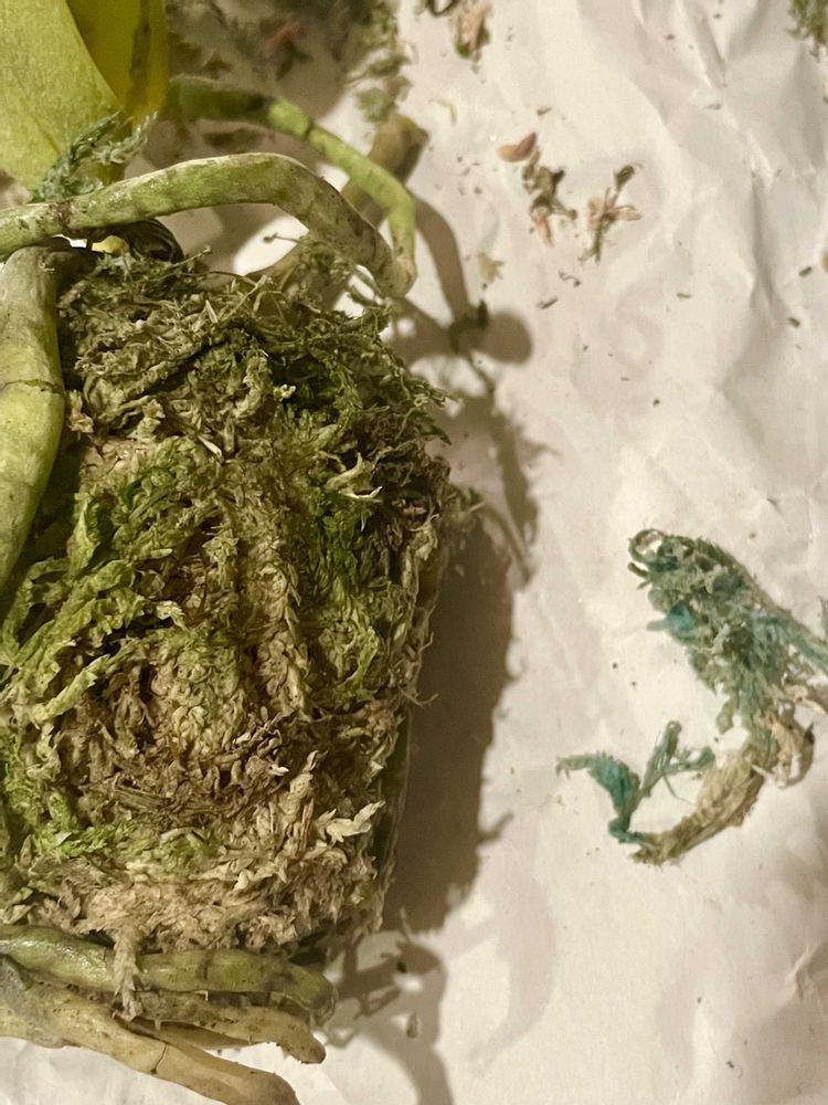 もう少し暖かくなり植え替えを待つ間に、枝や枯れた根を切って状態を保持しようと考えて飾りから抜いたところ、あまり見たことのない真緑色の苔があり戸惑っています。