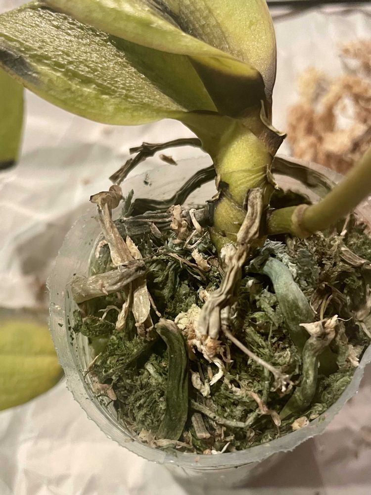 前回投稿時以降、水苔を大半交換して葉を全部落とし、透明なプラ鉢で常に保湿しながら様子を見ています。根自体は明らかにダメなもの以外は整理しなかったのですが、ちょっと黒っぽい根があるので早々になんとかしようと思いました。