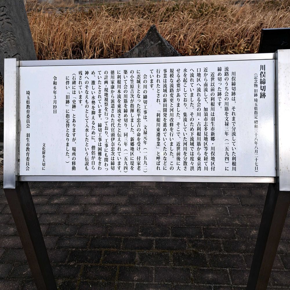 江戸期に関東平野を縦断し東京湾に注ぐ暴れ川の利根川をここで塞き止め房総半島の上、銚子方面に迂回させた巨大土木工事の事績の顕彰碑(顕彰ともよべぬただの碑ですが)がこじんまりとありました いまの関東地方の発展は家康公のその壮大なスケールの思考のもと利根川を治水した川奈忠次をはじめとした川奈家の連面、工事従事者の上に成り立っていることを真摯に思わねばなりますまい だとしたらこの碑は小さすぎやしませんか?そこらへんにある行政のどうでもよいような土地改良の石碑のほうがよほど大きいのはまったく理解不可能であります