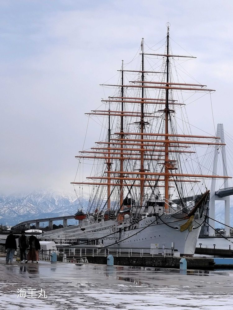 海王丸と雪を頂いた立山と日本海、絵になりますね。こちらでは荒れ狂う海と黒い雪雲‥まあ,それも好きですけどカップルで見に行くもんじゃないですね😄