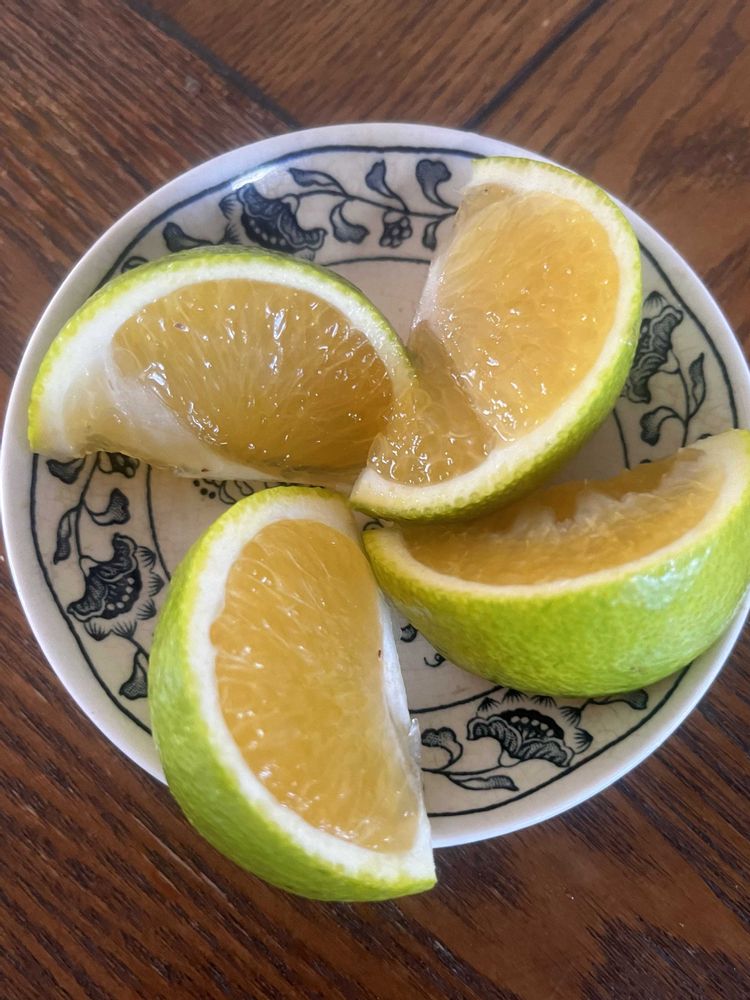 収穫期がわからず、昨年11月に実割れしたものを初めてコワゴワ食べた時のものが②③です。ライムっぽいと思いきや、夏みかんくらいの甘酸っぱさ。
