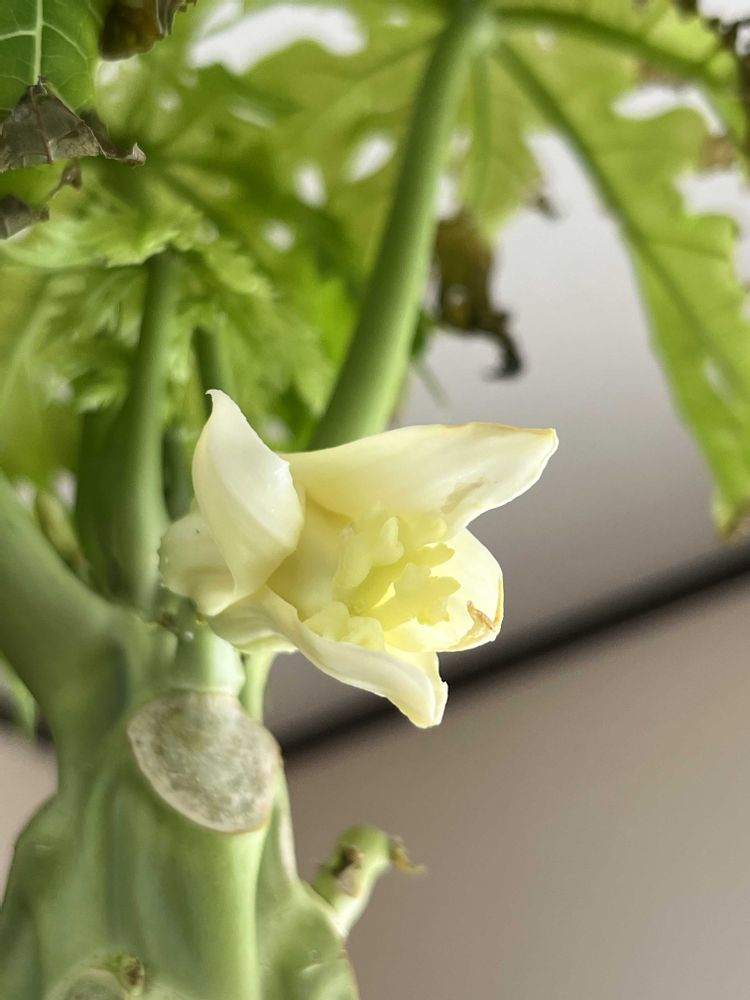 こちらもほぼ温室の部屋に取り込んだパパイヤ君。外で巨大化したのを大きな鉢に植え替えて重たかったけど枯れずに冬を越せそうです🥲🩷